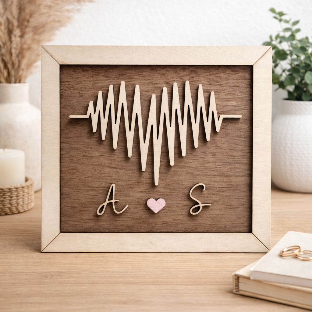 Offrez un cadeau unique et chargé d’émotion avec ce cadre décoratif en bois personnalisé, représentant un battement de cœur délicatement découpé, symbole d’amour et de lien éternel.